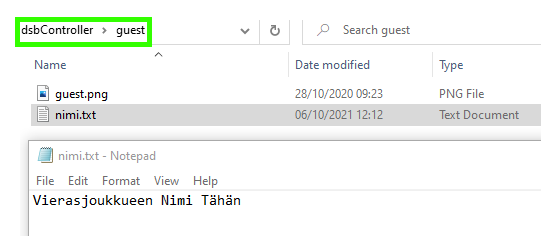 - guest: Vierasjoukkueen logo ja nimi. Logo on guest-niminen kuva ja nimi on .txt-muotoinen tekstitiedosto, jonka ensimmäisellä rivillä on joukkueen nimi. Tekstitiedoston nimi voi olla nimi.txt tai guest.txt. Jos halutaan käyttää kahden pelin tilaa, toisen vierasjoukkueen nimi voi olla nimi2.txt tai guest2.txt.