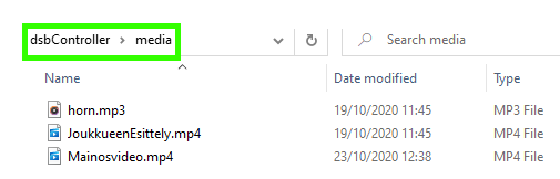- media: Ohjaustabletin valikon ”Näytä media” -painikkeella aukeavien video-, kuva- ja äänilistojen kautta toistettavat video-, kuva- ja äänitiedostot. Tulostaulun summerina voi käyttää oletussummerin sijaan omavalintaista audiotiedostoa, jolle annetaan nimeksi horn.mp3. Jos kansiossa ei ole tiedostoa, järjestelmä käyttää oletusääntä.