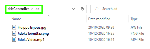 - ad: Tulostaululla pelin aikana näytettävät mainokset, jotka voivat olla kuvia ja videoita. Jos laitat kansioon usean kuvan ja/tai videon, ne kaikki esitetään peräkkäin näytöllä.